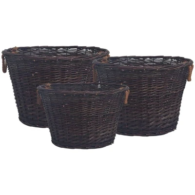 General description This 3-piece firewood basket set, crafted from full willow, offers a stylish and rustic storage solution for your firewood beside the fireplace. With two rope handles, these baskets are easy to carry and feature a strong, heavy-duty construction for long-lasting use. Their versatile design allows them to also serve as laundry or vegetable storage baskets, and they can be conveniently stacked into the largest basket when not in use. Technical specifications Colour: Dark brown Material: Full willow Dimensions (small): 40 x 25 cm (Diameter x H) Dimensions (medium): 50 x 35 cm (Diameter x H) Dimensions (large): 60 x 38 cm (Diameter x H) Assembly required: No Delivery includes 3 x Firewood baskets Other information