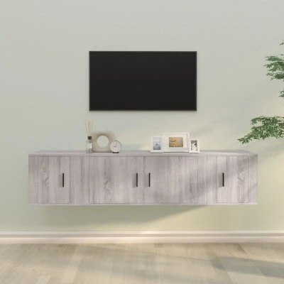 ManoManoGeneral description This classic TV cabinet set is designed to be a focal point of your room, featuring a trendy yet practical design. The engineered wood construction ensures exceptional quality, strength, stability, and resistance to moisture, making it easy to clean. Technical specifications Colour: Grey sonoma Material: Engineered wood Dimensions: 1 x TV cabinet: 100 x 34.5 x 40 cm (W x D x H) 2 x TV cabinet: 40 x 34.5 x 40 cm (W x D x H) Installation Each product is delivered with a manual for easy assembly. Screws and plugs for inside the wall are not included; it is advised to use screws and plugs suitable for your walls. If unsure, consult with a professional. Please read and follow each step of the instructions carefully. Usage These TV units provide ample storage space to keep all your magazines, DVDs, and other items well organized. The wall-mounted design saves floor space and allows for easy hanging. Practical doors keep your essentials free from dust by hiding them