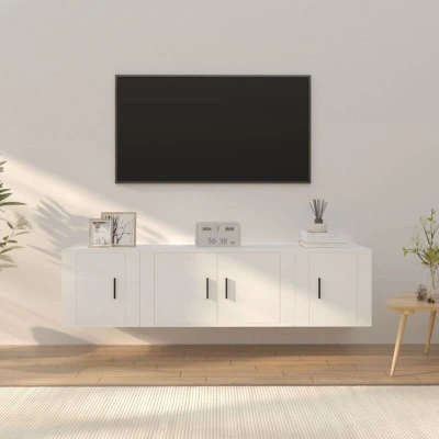 ManoManoGeneral description This classic TV cabinet set is designed to be a focal point of your room, featuring a trendy yet practical design. The engineered wood is of exceptional quality with a smooth surface, providing strength, stability, and resistance to moisture. These TV stands are easy to clean and offer ample storage space to keep your magazines, DVDs, and other items well organized. The wall-mounted design allows you to save floor space, and the practical doors help keep your essentials free from dust. Technical specifications Colour: White Material: Engineered wood Dimensions: 1 x TV cabinet: 80 x 34.5 x 40 cm (W x D x H) 2 x TV cabinet: 40 x 34.5 x 40 cm (W x D x H) Installation Each product is delivered with a manual for easy assembly. Screws and plugs for inside the wall are not included; it is advised to use screws and plugs suitable for your walls. If unsure, consult with a professional. Please read and follow each step of the instructions. Other information