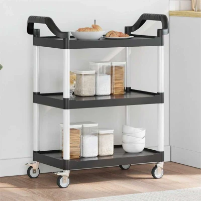 ManoManoGeneral description Create a distinctive touch and add more storage space with this 3-tier trolley. This versatile bar trolley can be used in various settings, such as the kitchen, dining room, living room, or garage, and serves as a drink cart, kitchen cart, or tool trolley. Technical specifications Colour: Black Material: Polypropylene (PP), aluminium, TPR (thermoplastic rubber) Dimensions: 81 x 41 x 92 cm (L x W x H) Shelf size: 66 x 41 cm (L x W) Wheel diameter: 7.5 cm Maximum load capacity: 130 kg Includes 4 wheels (2 with brakes) Assembly required: Yes Installation A rubber mallet is required during installation (not included in the delivery). Usage The kitchen trolley features 3 shelves, providing ample space to place snacks, drinks, vases, fruit bowls, or other decorative items. It comes with 4 rubber wheels and 2 handles, making it easy to move around. Additionally, 2 wheels are lockable for added control and safety. Other information