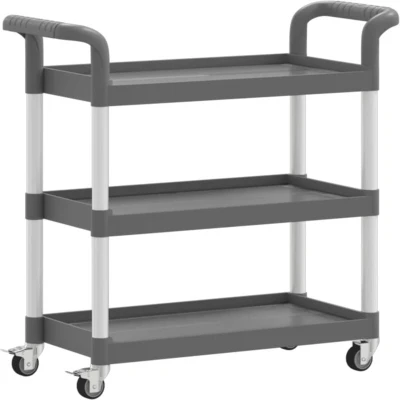 ManoManoGeneral description Create a distinctive touch and add more storage space with this 3-tier trolley. This versatile bar trolley can be used in various settings, such as the kitchen, dining room, living room, or garage, serving as a drink cart, kitchen cart, or tool trolley. Technical specifications Colour: Grey Material: Polypropylene (PP), aluminium, TPR (thermoplastic rubber) Dimensions: 77 x 34 x 72 cm (L x W x H) Shelf size: 59 x 31 cm (L x W) Wheel diameter: 5 cm Maximum load capacity: 80 kg Includes 4 wheels (2 with brakes) Assembly required: Yes Installation A rubber mallet is required during installation (not included in the delivery). Usage The kitchen trolley features 3 shelves, providing ample space to place snacks, drinks, vases, fruit bowls, or other decorative items. It comes with 4 rubber wheels and 2 handles for easy movement, with 2 wheels being lockable for added control and safety. Other information
