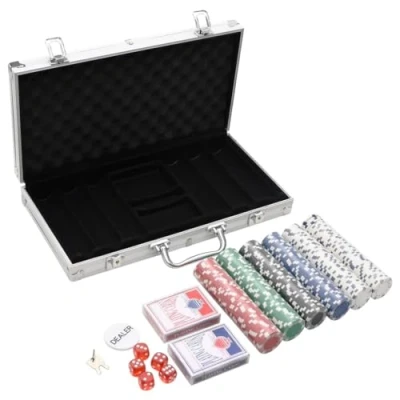 VidaXLThis poker chip set is a great way to get the casino feel at home with your friends and family. Professional poker set: This set includes 5 dice, 2 decks of cards, 1 dealer button, and 300 chips.Vivid chips: All the chips are in classic casino colours. Each chip weighs 11,5 g to give an authentic and premium feel.Portable carry case: The poker set comes with a stylish aluminium carry case that keeps everything together and organised. The case is lightweight and portable which makes it easy to store away when not in use and ideal to be taken from one venue to the next.