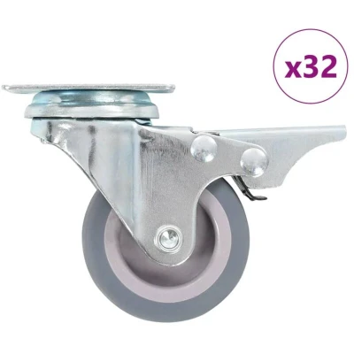 This set of 32 swivel casters with double brakes will be the perfect accessory for small equipment and furniture like workbench, trolley, coffee table, plant stand, bookshelf, shopping cart, etc. This set of 32 swivel casters, half with brakes, will be the perfect accessory for small equipment and furniture like workbench, trolley, coffee table, plant stand, bookshelf, shopping cart, etc. These casters are made of TPR (thermoplastic rubber) which is distinguished by a good shock and vibration resistance, enabling these casters to run smoothly and quietly. Additionally, their soft surfaces effectively protect your floor from scratching. Besides, the zinc-coated iron frame is highly rust-resistant and thus adds to the catser's sturdiness and durability. These swivel casters are equipped with brakes for flexible control. Each caster has a maximum loading capacity of up to 35 kg. Delivery includes 32 swivel casters, half with brakes.