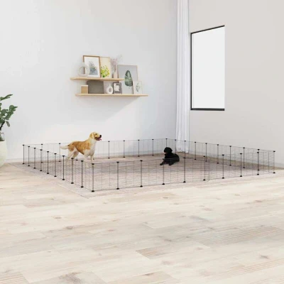 ManoManoGeneral description This trusty pet cage provides a spacious and safe enclosed space for your lovely pets to exercise, play, and rest. Made of sturdy powder-coated steel, it ensures durability and requires little maintenance. The cage features multiple panels, allowing you to assemble it into any shape and size you desire. It also includes a practical door for easy access to your pets. Technical specifications Colour: Black Material: Powder-coated steel Panel size (each): 35 x 35 cm (L x H) Grid height (each): 1.5 cm Delivery contains: 36 x Panel 72 x Connector 36 x Floor protector 118 x Tie rib 2 x Door clip Other information
