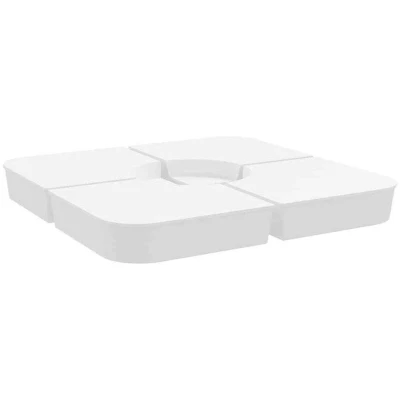 General description This parasol base set offers a sturdy and reliable foundation to ensure your umbrella remains stable and upright. Made of durable polypropylene, it provides high durability, wearability, and longevity. Fill the base with sand to create a reliable foundation, ensuring your umbrella stays securely in place. Each individual base with sand weighs 25 kg, allowing for a total weight of up to 100 kg. Technical specifications Colour: White Material: PP (Polypropylene) Overall dimensions: 100 x 100 x 11 cm (L x W x H) Dimensions (each item): 49 x 49 x 11 cm (L x W x H) Total weight (without sand): 9.45 kg Weight of each plate (with sand): 25 kg Total weight (with sand): 100 kg Sand filling capacity: 70 L Suitable for cantilever parasols with a cross-stand Assembly required: Yes Usage This parasol base set consists of four plates that can simply be put together to fix your crossbar base (not included). With a wide opening, the parasol base is simple to fill or empty with
