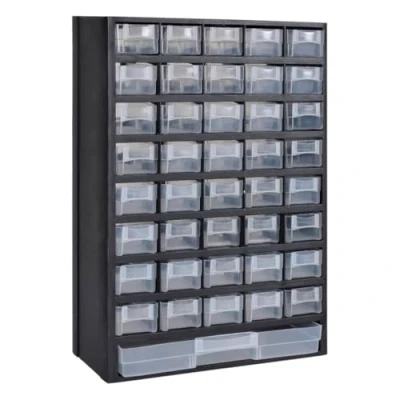 ManoManoGeneral description This 41-Drawer Plastic Tool Box is an excellent solution for organizing your workspace. It features 40 small drawers and one large drawer, making it ideal for storing various small items such as machine components, accessories, or DIY supplies. The durable transparent plastic construction allows for easy visibility of the contents stored within. Technical specifications Total size: 31 x 13.8 x 49 cm Frame material: plastic Box material: polypropylene Number of drawers: 40 small drawers and 1 large drawer Compatibility and accessories Easy to hitch to wall or other surfaces with 2 small holes on the back Other information