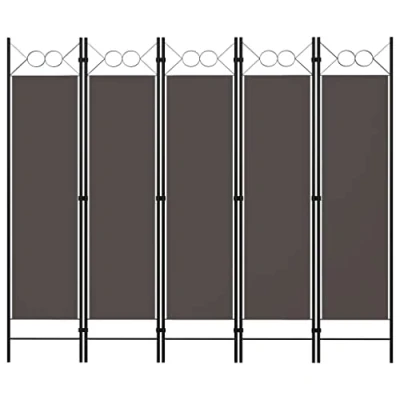 AmazonOur freestanding and practical 5-panel room divider can be used as a partition, privacy screen or for decoration It provides ideal privacy in the bedroom or a compartment of the room Top with circle design adds extra elegance.This room divider, made of powder-coated iron frame and fabric screens, can be easily folded when not in use.Note: The fabric does not block all light completely. Colour: Anthracite Material: Fabric (100% polyester), powder-coated iron Overall size: 200 x 180 cm (W x H)