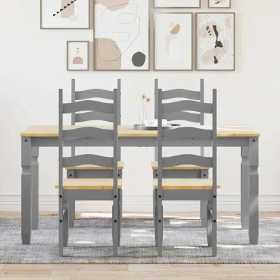 General description Create a warm and inviting place to start the day or enjoy a great meal together with this wooden dining set! The 5 Piece Dining Set Panama in Grey is crafted from solid pinewood, known for its strength and durability, featuring straight grains and distinctive knots that add to its rustic charm. This dining set includes a sturdy tabletop, making it ideal for serving meals, snacks, drinks, and showcasing your favorite decorations. Its minimalist design allows it to fit seamlessly into any environment in your home, whether in the kitchen or dining room. Technical specifications Colour: Grey Material: Solid pinewood with a honey wax finish Table dimensions: 160 x 80 x 75 cm (L x W x H) Chair dimensions: 42 x 47 x 107 cm (L x W x H) Max. weight capacity (per seat): 110 kg Assembly required: Yes Delivery contains: 1 x Dining table, 4 x Chairs Other information