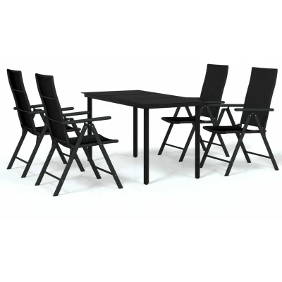 ManoManoGeneral description Create a compelling and cohesive aesthetic in your outdoor space with this 5 Piece Garden Dining Set. This set includes a sturdy garden table and four comfortable chairs, perfect for enjoying meals and gatherings outdoors. Technical specifications Table: Colour: Black Material: Powder-coated steel, glass Dimensions: 140 x 70 x 74 cm (L x W x H) Chair: Colour: Black Material: PE rattan, aluminium with a powder-coated finish Dimensions: 55 x 64 x 105 cm (W x D x H) Chair backrests recline in 7 positions Weather-resistant Assembly required: Yes Maximum weight capacity: 110 kg per seat Usage To maintain the longevity of your outdoor furniture, it is recommended to: Cover the furniture set during rain, snow, or frost. Clean regularly with a mild soap solution. Store in a cool, dry place indoors if possible. If stored outdoors, protect with a waterproof cover. Wipe and dry excess water or snow from flat surfaces after rain or snowfall. Allow sufficient air circulation to