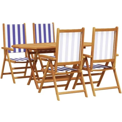 ManoManoGeneral description Walking into your garden or terrace becomes a joy with this fab outdoor furniture set. Great for summer get-togethers or just relaxing, its modern design aligns with what’s trendy while creating a comfy vibe. The smooth finish boosts its look, making your outdoor lounge all the more inviting. This set adds style and comfort, making it just right for entertaining friends or enjoying some peaceful time, which is why it’s a must-have for any outdoor retreat. Technical specifications Colour: Blue and white Material: Solid acacia wood Assembly required: Yes Delivery contains: 1 x Table, 4 x Chairs EAN: 8721288596666 SKU: 3375752 Brand: vidaXL Compatibility and accessories Foldable design for easy storage and transport Usage Perfect for outdoor gatherings and relaxation Easy to clean with a damp cloth Use a protective cover during harsh weather for longevity Other information