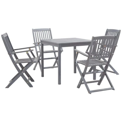 General description This stylish and contemporary wooden dining set consists of 1 dining table and 4 folding chairs, adding a luxurious touch to any dinner. Made of solid acacia wood with a grey wash, this garden furniture set is weather resistant, durable, and easy to clean with a damp cloth. The sturdy wooden structure ensures stability and safety, providing comfort and convenience for spending time with family and friends. The chairs can be easily folded away for storage and transportation when not in use. Technical specifications Material: Solid acacia wood with a grey wash Table dimensions: 80 x 80 x 74 cm (L x W x H) Chair dimensions (with armrests): 54 x 57 x 91 cm (W x D x H) Maximum weight capacity per seat: 110 kg Other information