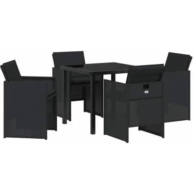 ManoManoGeneral description This Modern Garden Dining Set fits perfectly into outdoor spaces like gardens or terraces, showcasing a clean and simple design. It's not just aesthetically pleasing; it's also highly functional, making it an excellent choice for summer gatherings, barbecues, or relaxed family dinners outside. With a stylish blend of poly rattan and steel, this set adds a modern yet comfortable feel, enhancing the charm of any garden. Technical specifications Colour: Black Material: Poly rattan Seat width: 45.5 cm Seat depth: 38 cm Max weight capacity: 515 kg Assembly required: Yes Included elements: 1 table, 4 chairs EAN: 8721288655134 SKU: 3380593 Brand: vidaXL Other information