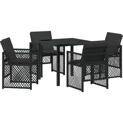 ManoManoGeneral description This Modern Garden Dining Set mixes style and practicality, making it a top pick for anyone who loves hosting outside. Its sleek design and minimalist vibe mean it slots into any garden or patio easily, creating a smart spot to share meals with your nearest and dearest. The poly rattan gives it a trendy look while staying comfy even if you’re sitting for a while. Whether you're having a laid-back brunch or a fancy dinner party, this dining set fits the bill, adding a touch of elegance and usefulness. Technical specifications Colour: Black Material: Poly rattan Assembly required: Yes Included Components: 1 x Garden table, 4 x Garden chairs EAN: 8721288655417 SKU: 3380621 Care & Maintenance Use protective covers when it’s not in use. Clean it regularly with a dry or damp cloth to maintain its original appearance. Check and tighten any screws or bolts periodically to ensure it stays sturdy. Other information