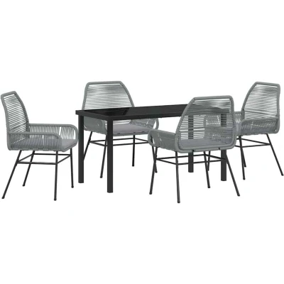 ManoManoGeneral description This Modern Garden Dining Set adds a touch of class to any outside space with its sleek lines and practical design. It’s ideal for al fresco dining, blending style and usefulness perfectly to match modern outdoor areas. Great for sunny get-togethers, it’s made to keep guests comfy while uplifting the vibe of your garden or terrace. Technical specifications Colour: Grey Material: Poly rattan Seat width: 40 cm Seat depth: 48 cm Max weight: 515 kg Maximum weight per seat: 110 kg Assembly required: Yes Delivery contains: 4 x Garden chairs, 1 x Table EAN: 8721288658050 SKU: 3380885 Brand: vidaXL Usage Perfect for everything from quiet dinners to bigger gatherings. Ideal for relaxed weekend brunches or fancy dinner parties. Other information Be aware of the risk of open fires and other sources of strong heat in the vicinity of the product.