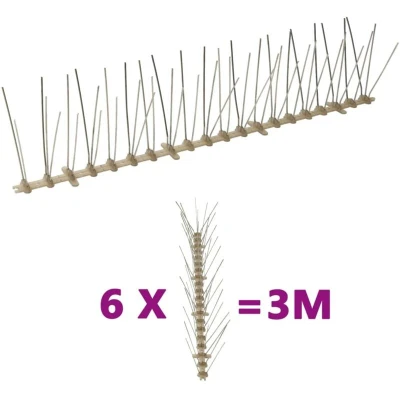 General description This bird control spikes set is ideal for protecting your house and garden from unwanted intruders, such as birds, cats, and raccoons. It offers a humane, harmless, easily applicable, and highly effective method of repelling birds and other pests. Technical specifications Material: Plastic, stainless steel Each spike base size: 50 x 2.5 cm (L x W) Total length: 3 m Pin height: 115 mm Spikes in 5 rows Delivery contains: 6 x Bird spike SKU: 149128 Other information