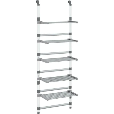 General description This classic 5-tier hanging laundry drying rack is an ideal choice for families with limited drying space. The aluminium frame ensures sturdiness and stability, while the space-saving design allows each drying tier to be folded separately when not in use. The adjustable height feature lets you extend the rack from 147 to 187 cm, making it customizable to your needs. It can be easily hung on a door or shower screen using 2 hooks and is also suitable for wall mounting. Technical specifications Colour: Silver Material: Aluminium, PS (polystyrene), PE (polyethylene), PP (polypropylene) Overall dimensions: 50 x 25 x (147-187) cm (W x D x H) Adjustable height: 147 - 187 cm Assembly required: Yes Other information