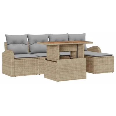 vidaXL 6 Piece Garden Dining Set with Cushions Beige Poly Rattan Acacia