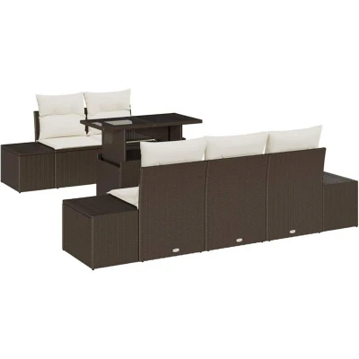 ManoManoGeneral description This Garden Sofa Set with Cushions offers a stylish yet relaxed space for outdoor lounging or entertaining. Its sleek design makes it a perfect fit for any garden or terrace, combining aesthetics with functionality. Enjoy the comfort of soft cushions and a durable poly rattan construction, ideal for gatherings or quiet moments in the sun. Technical specifications Colour: Brown and cream Material: Poly rattan and powder-coated steel Overall dimensions: 100 x 55 x 73 cm (L x W x H) Weight: 39.7 kg Seating area: 55 x 55 cm (W x D) Frame material: Powder-coated steel Filling material: Foam Indoor / outdoor: Outdoor only Number of items: 6 Assembly required: Yes EAN: 8721288380340 SKU: 3357831 Compatibility and accessories Includes: 1 x Centre seat, 4 x Side sofas, 1 x Table Seat cushion removable: Zip fastening Installation Assembly required for setup. Usage Designed for outdoor use, perfect for summer weather. Easy to maintain; protect from rain and store cushions