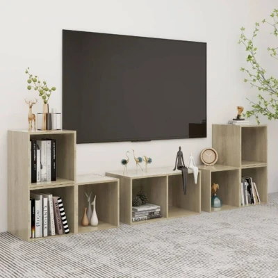 General description This classic TV cabinet set is designed to be a focal point of your room with a trendy yet practical design. It is equipped with ample storage space for keeping your magazines, books, DVDs, and multimedia devices well organized and within reach. Each TV unit can be placed horizontally or vertically, making it a perfect addition to your current living space. Additionally, the HiFi cabinet set is easy to clean with a damp cloth. Technical specifications Colour: Sonoma oak Material: Engineered wood Assembly required: Yes 4 x TV cabinet: 37 x 35 x 37 cm (W x D x H) 2 x TV cabinet: 72 x 35 x 36.5 cm (W x D x H) Other information