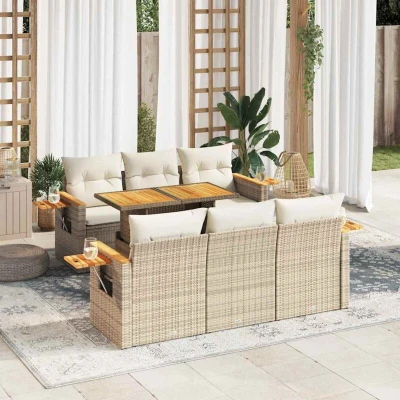 vidaXL 7 Piece Garden Sofa Set with Cushions Beige Poly Rattan Acacia
