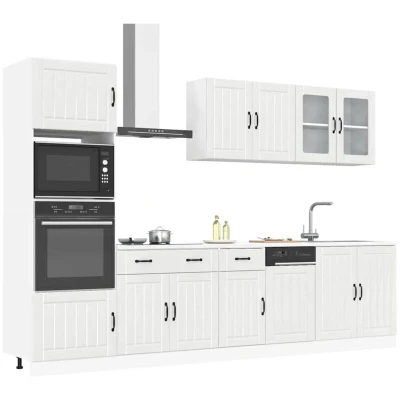 This 7-piece kitchen cabinet set, with its elegant design, optimises your kitchen space and provides ample storage space for your personal belongings! Stable and durable material: Engineered wood is a durable and stable material with a smooth surface that is resistant to moisture, warping, and splitting, making it a reliable choice for a variety of projects.Ample storage space: The kitchen cabinet set has many compartments, and offers sufficient space to store bowls, plates, pots, and other kitchen appliances.Adjustable feet: The bottom cabinets feature adjustable feet that can be adjusted in height to suit your kitchen layout.Easy to maintain: Thanks to its smooth surface, these kitchen cabinets are easy to clean with a damp cloth and require less maintenance. Warning:To prevent it from tipping over, this product must be used with the provided wall attachment device. Good to know:Screw(s) and plug(s) for inside the wall are not included. Seek and use screw(s) and plug(s) suitable for your walls. If you are uncertain, seek professional advice. Read and follow each step of the instruction carefully.The worktop, sink and faucet are not included in the delivery.
