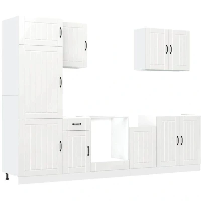 This 7-piece kitchen cabinet set, with its elegant design, optimises your kitchen space and provides ample storage space for your personal belongings! Stable and durable material: Engineered wood is a durable and stable material with a smooth surface that is resistant to moisture, warping, and splitting, making it a reliable choice for a variety of projects.Ample storage space: The kitchen cabinet set has many compartments, and offers sufficient space to store bowls, plates, pots, and other kitchen appliances.Adjustable feet: The bottom cabinets feature adjustable feet that can be adjusted in height to suit your kitchen layout.Easy to maintain: Thanks to its smooth surface, these kitchen cabinets are easy to clean with a damp cloth and require less maintenance. Warning:This product must be secured by installing a worktop. Good to know:Screw(s) and plug(s) for inside the wall are not included. Seek and use screw(s) and plug(s) suitable for your walls. If you are uncertain, seek professional advice. Read and follow each step of the instruction carefully.The worktop, sink and faucet are not included in the delivery.