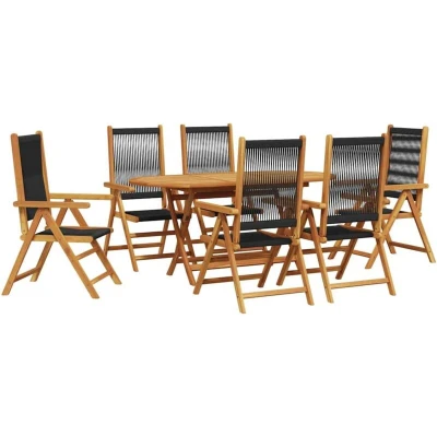 ManoManoGeneral description This Garden Dining Set is perfect for outdoor meals with family or friends. With its trendy feel, smooth texture, and oval shape, it enhances any garden setting. The rich brown color blends beautifully with nature, offering both style and functionality for alfresco dining. Technical specifications Colour: Black Material: Solid acacia wood and poly rattan Maximum weight capacity: 110 kg per seat Assembly required: Yes Includes: 1 x Table, 6 x Chairs EAN: 8721288596512 SKU: 3375737 Handy Features Foldable design for easy storage and transport Sturdy armrests and poly rattan backrest for added comfort Solid acacia wood legs for stability on uneven ground Care & Maintenance Wipe down with a damp cloth to keep it looking good Use a cover when not in use to protect from the elements Other information