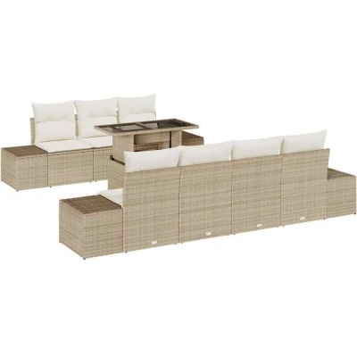 ManoManoGeneral description Meet the Garden Sofa Set with Cushions—a fabulous addition to any outdoor patio, terrace, or garden. With a sleek design featuring clean lines, it enhances any outdoor space. Perfect for those who value both style and flexibility, this set is easy to rearrange and customize for seating. Each piece is built to withstand outdoor conditions, providing a comfortable spot to relax or socialize in spacious open-air areas. Technical specifications Colour: Beige and cream Material: Poly rattan and powder-coated steel Overall dimensions: 100 x 55 x 73 cm (L x W x H) Weight: 57.9 kg Seating area: 55 x 55 cm (W x D) Frame material: Powder-coated steel Filling material: Foam Indoor / outdoor: Outdoor only Number of items: 8 Assembly required: Yes EAN: 8721288380678 SKU: 3357864 Included Components This set includes three centre seats, four side sofas, and a table with a glass top. Each part is designed for comfort and convenience, featuring polyester cushions filled with foam