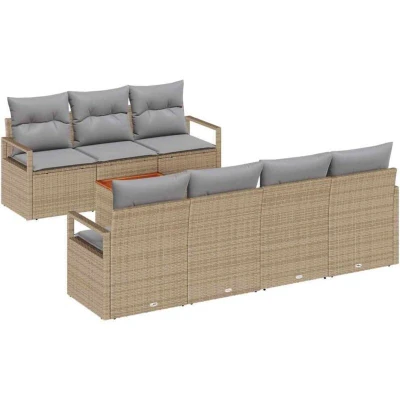 ManoManoGeneral description This modular garden furniture set captures the essence of modern outdoor living. Designed to blend seamlessly with garden environments, its rectangular configuration offers a chic yet functional seating arrangement. The woven texture combined with its solid build invites leisurely afternoons spent basking in the sun or social gatherings in your terrace or backyard. Its modern style, marked by simplicity and minimal adornment, ensures it complements various outdoor atmospheres. Technical specifications Colour: Beige Material: Poly rattan Back height: 69 cm Assembly required: Yes Delivery contains: 3 x Centre seat 4 x Arm sofas 1 x Garden table EAN: 8721158977793 SKU: 3347665 Brand: vidaXL Compatibility and accessories Adjustable Feet Modular design allows for various configurations Installation Assembly is required for the set. Usage Ideal for outdoor settings such as gardens, terraces, and backyards. Perfect for social gatherings or relaxing afternoons. Other