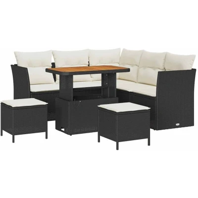 ManoManoGeneral description This Garden Sofa Set combines modern simplicity with practical use, enhancing your outdoor area. Ready for any weather, it features a shiny steel frame complemented by the natural beauty of acacia wood and durable poly rattan. The clean lines and simple style ensure it looks great while providing comfort. Ideal for gardens, terraces, or patios, this set is perfect for lazy summer days or gatherings, offering ample seating and a welcoming atmosphere. Technical specifications Colour: Black Material: Poly rattan, acacia wood, steel Max weight capacity: 845 kg Assembly required: Yes Delivery includes: 3 x Corner seats 2 x Centre seats 2 x Stools 1 x Table EAN: 8721288416049 SKU: 3361485 Brand: vidaXL Other information