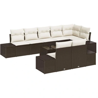 ManoManoGeneral description This Garden Sofa Set with Cushions is the epitome of modern sophistication and functional design, crafted to complement your outdoor living spaces. Combining a striking modular design with premium materials, this elegant set offers the flexibility to personalize your seating arrangements without compromising on style or comfort. Whether lounging under the open sky or hosting garden parties, its visually appealing woven texture makes it a versatile centerpiece for terraces and backyards. Imagine relaxing on the plush cushions, enveloped by nature while enjoying the company of loved ones in this charming oasis, designed for both style and substance. Technical specifications Colour: Brown and cream Material: Poly rattan Assembly required: Yes Corner seat dimensions: 62 x 62 x 69 cm (LxWxH) Centre seat dimensions: 55 x 62 x 69 cm (LxWxH) Side sofa dimensions: 184 x 62 x 69 cm (LxWxH) Table dimensions: 55 x 55 x 37 cm (LxWxH) EAN: 8721158967046 SKU: 3347118 Brand: