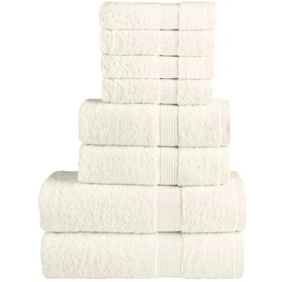 ManoManoGeneral description This 8 Piece Premium Towel Set in Cream is perfect for both domestic and commercial use. Made from 100% ring-spun cotton, these towels are super soft, durable, and fade-resistant, ensuring long-lasting quality. Technical specifications Material: 100% cotton Weight: 600 gsm Guest towel size: 30 x 50 cm (W x L) Hand towel size: 50 x 100 cm (W x L) Shower towel size: 70 x 140 cm (W x L) OEKO-TEX STANDARD 100 certified Usage Ideal for various needs including beauty treatments and everyday cleaning tasks. Machine washable with warm water and light soap. Other information Delivery contains: 4 x Guest towel, 2 x Hand towel, 2 x Shower towel SKU: 137550