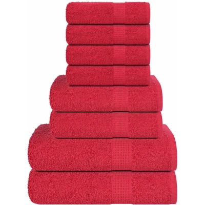 ManoManoGeneral description This 8 Piece Towel Set in vibrant red is crafted from 100% ring-spun cotton, making it soft, durable, and fade-resistant. Ideal for both domestic and commercial use, this towel set is designed to meet various needs with its absorbent and versatile nature. Technical specifications Material: 100% cotton Colour: Red Guest towel size: 30 x 50 cm (W x L) Hand towel size: 50 x 100 cm (W x L) Shower towel size: 70 x 140 cm (W x L) Weight: 360 gsm OEKO-TEX STANDARD 100 certified Compatibility and accessories Delivery contains: 4 x Guest towel 2 x Hand towel 2 x Shower towel Installation Convenient hanging loop for easy storage on hooks or towel bars. Usage Machine washable with warm water and light soap. Suitable for beauty treatments or everyday cleaning tasks. Other information