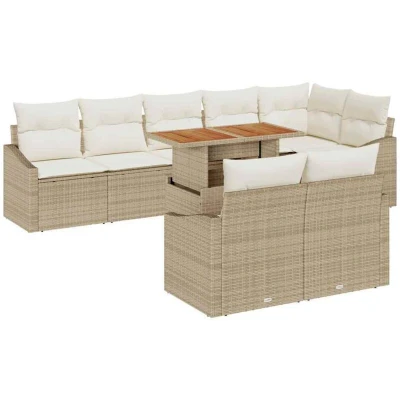 ManoManoGeneral description This garden sofa set combines modern aesthetics with practicality, making it an excellent choice for any outdoor area. With a modular design, you can rearrange the pieces to suit your space and needs, keeping your garden or terrace lively and inviting. Its sleek style features clean lines that blend seamlessly with contemporary outdoor settings, creating a welcoming atmosphere for entertaining or relaxing. Technical specifications Colour: Beige and cream Material: Poly rattan, steel, and solid acacia wood Overall dimensions: 100 x 55 x 73 cm (L x W x H) Weight: 57.5 kg Seating area: 55 x 55 cm (W x D) Frame material: Powder-coated steel Filling material: Foam Number of items: 9 Assembly required: Yes EAN: 8721158999689 SKU: 3349854 Compatibility and accessories Includes: 4 x Arm sofa with storage function 1 x Corner seat with storage function 3 x Centre seat with storage function 1 x Garden table Comes with 8 removable polyester cushions filled with foam