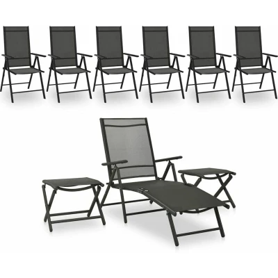 ManoManoGeneral description This garden lounge set, featuring a stylish and timeless design, has everything you need to relax and take a load off in the outdoors. Made of lightweight aluminium frames, this outdoor furniture set is easy to carry. The seats are comfortable with breathable textilene, and the adjustable backrest offers 7 positions for optimal comfort. The footstools are perfect for putting your feet up and can also serve as additional seating for children. Each piece can be easily folded away when not in use to save space. Technical specifications Colour: Black and anthracite Material: Aluminium, textilene Dimensions of sun lounger: 178 x 61.5 x 60 cm (L x W x H) Dimensions of footrest/table: 50 x 41 x 38 cm (W x D x H) Dimensions of chair: 54 x 73 x 107 cm (W x D x H) Maximum weight capacity: 110 kg per seat Foldable design Chair backrest adjustable in 7 positions Assembly required: Yes Delivery contains: 6 x Chair, 1 x Sun lounger, 2 x Footrest/table SKU: 3070643 Usage To