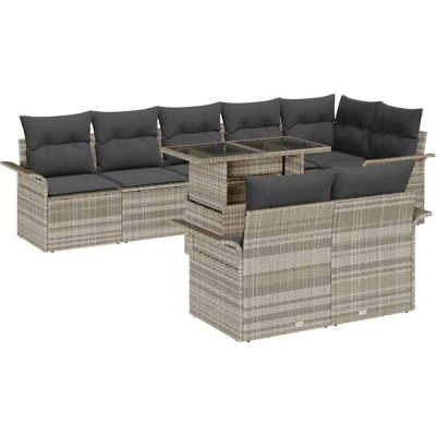 ManoManoGeneral description This Garden Sofa Set boasts a flexible modern design that fits right into any outdoor spot. With its neat lines and minimalist vibe, it becomes the centrepiece of your garden or terrace, providing a chilled-out atmosphere for family get-togethers or friendly catch-ups. Its texture, comfort, and style are guaranteed to elevate your outdoor living experience. Technical specifications Colour: Light grey Material: Poly rattan Back height: 69 cm Assembly required: Yes Delivery contains: 1 x Corner seat 3 x Centre seat 4 x Arm sofa 1 x Table EAN: 8721288372482 SKU: 3357045 Brand: vidaXL Compatibility and accessories Modular design allows for easy adjustment or expansion Weather-resistant cushions included Installation Assembly is required for the sofa set Usage Ideal for outdoor gatherings and relaxation Table can be used as both a coffee table and a dining surface Other information