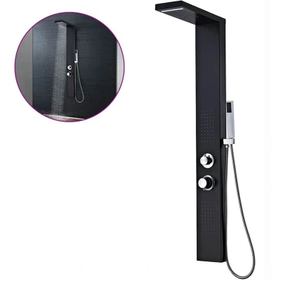 General description This multifunctional shower panel system features a stylish matte black design, making it a great addition to your bathroom. Made from durable aluminium, this shower tower offers a beautiful square design and provides a truly relaxing shower experience with its four functions: rainfall, waterfall, massage jets, and a handheld showerhead, all easily selectable via a knob. Technical specifications Colour: Matte black Panel material: Aluminium Handheld showerhead and knobs: Chrome plated Dimensions: 15 x 47 x 130 cm (W x D x H) Waterfall width: 12.5 cm Rainfall shower size: 23 x 14 cm (L x W) Massage jets size (each set): 20.5 x 10.8 cm (L x W) Handheld shower size: 2.8 x 2.8 x 21 cm (W x D x H) Stainless steel hose length: 150 cm Functions: Rainfall, waterfall, 2 sets of body massage jets, handheld showerhead 150 jets with silicon nozzles: 50 on the rainfall showerhead and 50 on each set of body massage jets Silicon nozzles resistant to limescale buildup Standard