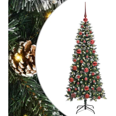 ManoManoGeneral description This contemporary artificial Christmas tree offers an elegant festive touch to any space. Blending modern design with holiday tradition, it serves as an ideal centerpiece for both indoor and outdoor festivities, emanating a welcoming glow. Technical specifications Colour: Green Material: PVC, plastic, and steel Tree height: 150 cm Bottom diameter: 66 cm Stand size: 35 x 35 cm Number of PVC tips: 440 Number of pine cones: 23 Number of baubles: 61 Lights type: LED strip lights Lights color: Warm white Lights length: 150 cm Number of LEDs: 150 Distance between LEDs: 10 cm LED flash modes: 8 Power source: USB Batteries Included: No Voltage: 5 V Wattage: 5 W Indoor / outdoor: Indoor and sheltered outdoor use Assembly required: Yes EAN: 8721288987686 SKU: 3395808 Brand: vidaXL Compatibility and accessories 1 x Artificial Christmas tree 1 x Foldable stand 1 x LED string light 1 x Peak 20 x 3 cm ball 21 x 4 cm ball 20 x 6 cm ball Installation Simple assembly requiring just