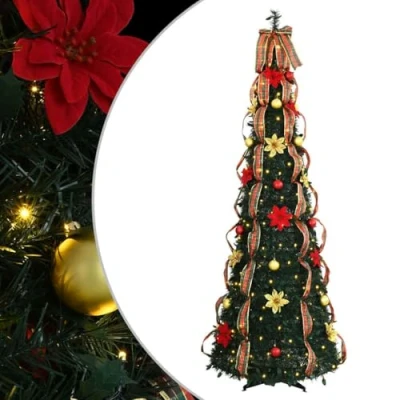 VidaXLThis Pre-lit Artificial Christmas Tree elegantly captures the holiday spirit with its enchanting and seasonal presentation. Crafted for those who cherish decorative flair, its Art Deco-inspired design gleams with geometric precision, making it a stylish focal point in any space. Lightweight and portable, it effortlessly adorns both living rooms and terraces, creating a festive ambiance that invites joy and celebration. Materials: Made from durable PVC, this tree is designed to last through many holiday seasons. The material's resilience ensures it maintains a fresh look, resisting the wear that often accompanies annual decorations. An iron core structure provides stable support, ensuring the tree stands upright and secure, ready to be adorned with festive embellishments. Included Components: Featuring LED decorative string lights, this tree includes 8 flash modes to enhance its aura. The USB power source offers convenience, eliminating the need for traditional adapters and allowing for flexible placement. Ensure safe and efficient luminous displays with its thoughtfully designed LED elements. Features /Function /Design: With a pop-up design, the tree is quickly set up without fuss, efficiently creating a festive presence. The collapsible feature facilitates effortless storage post-holidays, reducing space constraints. Additionally, its transport-friendly nature allows relocation with minimal effort, adapting to various celebratory settings. Recommended Uses: Suitable for indoor and sheltered outdoor areas, this tree embellishes living rooms, gardens, and terraces with its festive charm. Its versatility aligns with personal gatherings or grand holiday affairs, suitably enhancing joyous occasions. Care &Maintenance: Maintain its lustrous appeal by avoiding the use of harsh chemicals and abrasives. Cleaning involves gentle dusting or wiping, ensuring it remains vibrant and inviting annual use.