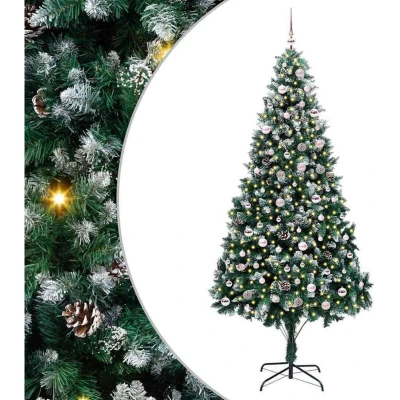ManoManoGeneral description The PVC Artificial Christmas Tree combines the charm of a traditional holiday centerpiece with the convenience of modern LED lighting features. Designed for both indoor and sheltered outdoor spaces, its cone-shaped structure, decorated with pine cones and tipped with white snow, creates a magical holiday atmosphere perfect for your living room, garden, or terrace. This beautiful seasonal piece invites the spirit of Christmas into any setting. Technical specifications Colour: Green Material: PVC, steel, and plastic Tree height: 240 cm Bottom diameter: 130 cm Number of PVC tips: 2021 Number of LEDs: 300 LED flash modes: 8 Power source: USB (5V) Batteries Included: No Indoor / outdoor: Indoor and sheltered outdoor use Assembly required: Yes Compatibility and accessories 1 x Christmas tree 1 x Stand 1 x LED string light 1 x Peak 40 x 6 cm ball 40 x 4 cm ball 40 x 3 cm ball Usage The tree is equipped with integrated LED strip lights that offer flexible illumination