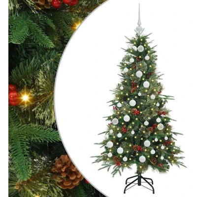 ManoManoGeneral description This modern Artificial Hinged Christmas Tree features a unique cone-shaped design, perfect for enhancing the festive atmosphere in any room or outdoor space. Crafted with durable PVC and PE materials, it offers a fade-resistant surface that ensures lasting appeal throughout the season. The tree is equipped with warm white LED decorative string lights, providing a cozy ambiance that transforms any setting into a festive retreat. Technical specifications Colour: Green Material: PE and PVC Tree height: 150 cm Bottom diameter: 68 cm Stand size: 35 cm Number of PE tips: 77 Number of PVC tips: 303 Number of needle tips: 76 Number of pine cones: 40 Number of red berries: 40 Number of baubles: 61 Lights type: Decorative string lights Lights color: Warm white Lights length: 3000 cm Number of LEDs: 150 Distance between LEDs: 10 cm LED flash modes: 8 Power source: USB Voltage: 5 V Batteries Included: No Indoor / outdoor: Indoor and sheltered outdoor use Assembly required: Yes