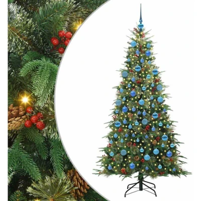 General description This modern Christmas tree decoration features a unique cone-shaped design, ideal for enhancing the festive atmosphere in any room or outdoor space. Crafted with PVC and PE materials, this piece offers a fade-resistant surface that ensures lasting appeal throughout the season. Equipped with warm white LED decorative string lights, it brings an elegant sparkle to your space, creating a cozy, inviting ambiance that transforms any setting into a festive retreat. Technical specifications Colour: Green Material: PE and PVC Tree height: 180 cm Bottom diameter: 90 cm Stand size: 45 cm Number of PE tips: 109 Number of PVC tips: 451 Number of needle tips: 108 Number of pine cones: 50 Number of red berries: 50 Number of baubles: 120 Lights type: Decorative string lights Lights color: Warm white Lights length: 3000 cm Number of LEDs: 300 Distance between LEDs: 10 cm LED flash modes: 8 Power source: USB Voltage: 5 V Batteries Included: No Indoor / outdoor: Indoor and sheltered