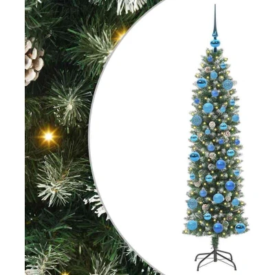 ManoManoGeneral description The Artificial Slim Christmas Tree is an elegant and compact festive decoration that combines modern style with seasonal charm. Its slim, cone-shaped profile maximizes space, making it ideal for smaller living rooms or sheltered outdoor settings. The tree features lifelike PVC tips and warm white LED lights, creating a warm and inviting atmosphere during the holiday season. Technical specifications Colour: Green and white Material: PVC, metal, and plastic Tree height: 150 cm Bottom diameter: 43 cm Stand size: 35 cm Number of PVC tips: 266 Number of pine cones: 10 Lights type: LED strip lights Lights color: Warm white Number of LEDs: 150 Distance between LEDs: 10 cm LED flash modes: 8 Power source: USB (not included) Voltage: 5 V Indoor / outdoor: Indoor and sheltered outdoor use Assembly required: Yes EAN: 8721288982483 SKU: 3395288 Brand: vidaXL Installation The tree is designed for user-friendly installation, requiring minimal tools and effort. Following the