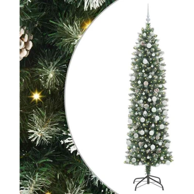 ManoManoGeneral description The Artificial Slim Christmas Tree is an elegant and compact festive decoration that combines modern style with seasonal charm. Its slim, cone-shaped profile maximizes space, making it ideal for smaller living rooms or sheltered outdoor settings. The tree features lifelike PVC tips and warm white LED lights, creating a warm and inviting atmosphere during the holiday season. Technical specifications Colour: Green and white Material: PVC, metal, and plastic Tree height: 210 cm Bottom diameter: 55 cm Stand size: 45 cm Number of PVC tips: 450 Number of pine cones: 20 Lights type: LED strip lights Lights color: Warm white Number of LEDs: 300 Distance between LEDs: 10 cm LED flash modes: 8 Power source: USB (not included) Voltage: 5 V Indoor / outdoor: Indoor and sheltered outdoor use Assembly required: Yes EAN: 8721288982681 SKU: 3395308 Brand: vidaXL Installation The tree is designed for user-friendly installation, requiring minimal tools and effort. Following the