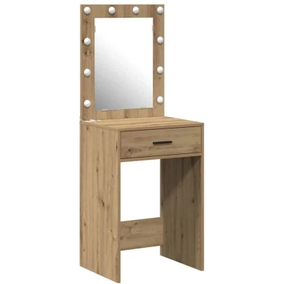 ManoManoGeneral description This modern dressing table in artisan oak combines simplicity and functionality, making it a perfect fit for any bedroom style. Its neat design with clean lines exudes understated elegance, ideal for contemporary spaces. The built-in LED lights provide excellent brightness, making it perfect for tasks like makeup application or hairstyling, giving you a salon-like experience at home. With spacious storage options, you can keep your personal items organized and easily accessible. Technical specifications Colour: Artisan oak Material: Engineered wood Overall dimensions: 50 x 41 x 135 cm (L x W x H) Weight: 18.2 kg Power source: Plug Number of drawers: 2 Includes: Plane mirror Indoor use only Assembly required: Yes EAN: 8721158850737 SKU: 865045 Brand: vidaXL Other information Note: Use only certified DC 5V input. Higher voltage may cause overheating and damage to the device, posing a risk of fire. This product should not be used by children under 14 years or