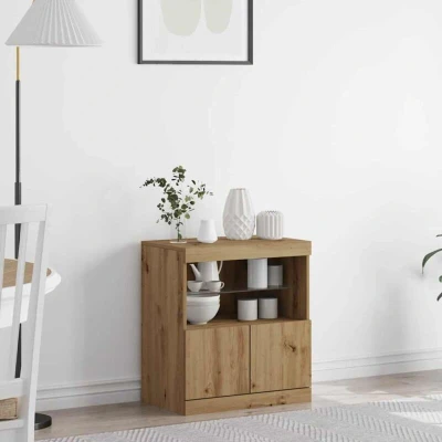 ManoManoGeneral description This sideboard is a stylish storage solution for modern homes, combining form and function seamlessly. With a rustic style and rectangular shape, it complements your living room decor while providing ample shelf space for your essentials. The sleek surface and integrated lighting enhance its appeal, making it an attractive addition to any living space. Technical specifications Dimensions: 60 x 37 x 67 cm Material: Engineered wood Colour: Brown Power: DC 5V (USB power source not included) Installation Assembly required: Yes Recommended to have assistance during assembly for improved stability and functionality. Usage Ideal for storing collectibles, crockery, and other essentials. Integrated LED strip lights enhance visibility and add a stylish touch. Other information Warning: Higher voltage may cause overheating and damage to the device, posing a risk of fire.
