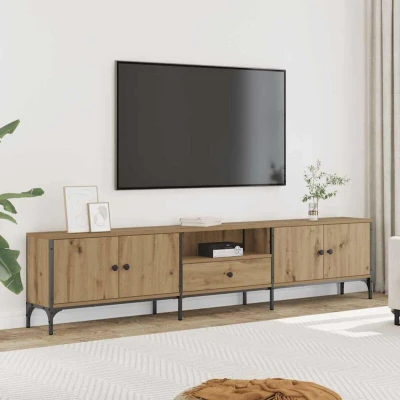 General description Featuring a trendy yet practical design, this TV cabinet will become a focal point of your room. The engineered wood construction ensures exceptional quality with a smooth surface, providing strength, stability, and resistance to moisture. The metal frame enhances sturdiness and stability, making it a reliable addition to your home. Technical specifications Colour: Artisan oak Material: Engineered wood, metal Dimensions: 200 x 25 x 44 cm (L x W x H) Max. weight capacity per shelf: 20 kg Assembly required: Yes Usage Ample storage space for magazines, DVDs, or other items, keeping them well-organised and within reach. The sturdy tabletop is ideal for displaying decorative objects, photo frames, or potted plants. Practical doors help keep your essentials free from dust. Adjustable feet with plastic pads maintain balance on uneven ground and increase stability. Other information