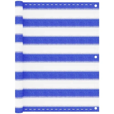 General description With this HDPE balcony screen, you can enjoy privacy while relaxing or sunbathing on your balcony. This balcony shade, made from high-density polyethylene (HDPE), is mould and UV proof. The special "open" fabric structure allows wind to go through, ensuring a fresh breeze on the balcony. Technical specifications Colour: Blue and white Material: 100% HDPE (high-density polyethylene) Size: 75 x 500 cm (L x W) Fabric density: 160 g/m² Wind and water permeable Mould and UV proof, breathable HDPE Aluminium eyelets 24 m PE rope included Assembly required: No Installation The shield can be easily attached to the balcony using its aluminium eyelets and the included rope. Other information
