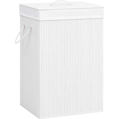 General description This bamboo laundry basket is an ideal solution for any household. It keeps your dirty laundry out of sight while adding a decorative touch to your decor. The interior liner is made of woven fabric, which does not absorb moisture or odors, and is removable for convenient transport to the washing machine. With a large volume of 72 liters, it provides ample space for organizing and storing clothes. Equipped with handles, it can be easily moved around and is collapsible for easy storage, making it perfect for living room, bathroom, and bedroom organization. Additionally, this multifunctional hamper can also be used for storing children's toys. Technical specifications Colour: White Material: Bamboo, woven fabric Dimensions: 40 x 30 x 60 cm (W x D x H) Shape: Rectangular Capacity: 72 L With a removable fabric liner With a handle on the lid With a handle on each side With 2 sections Lightweight and portable Collapsible for easy storage Please note: the laundry basket