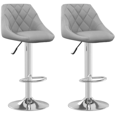 General description Enjoy a glass of wine, grab a bite, or just relax while you sit on these stylish bar stools. Upholstered in soft-to-touch light grey velvet, these bar chairs provide optimal seating comfort. The sturdy chromed steel frame ensures durability, while the built-in footrest enhances your seating experience. With a gas lift mechanism, these stools are height adjustable, making them a perfect addition to any functional bar or dining area. They also swivel 360 degrees for added flexibility. Technical specifications Colour: Light grey Material: Velvet (100% polyester), chromed steel Dimensions: 46 x 44 x (82-103) cm (W x D x H) Seat depth: 38.5 cm Backrest height: 30.5 cm Base diameter: 38.5 cm Maximum weight capacity: 110 kg per seat 360 degrees swivelling Gas lift mechanism With built-in footrest Adjustable in height: Yes Assembly required: Yes Delivery contains: 2 x Bar stool Other information
